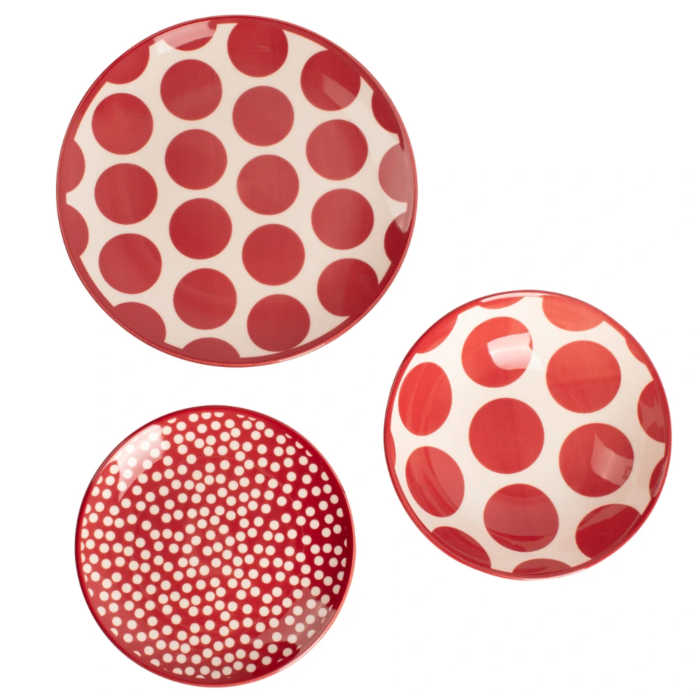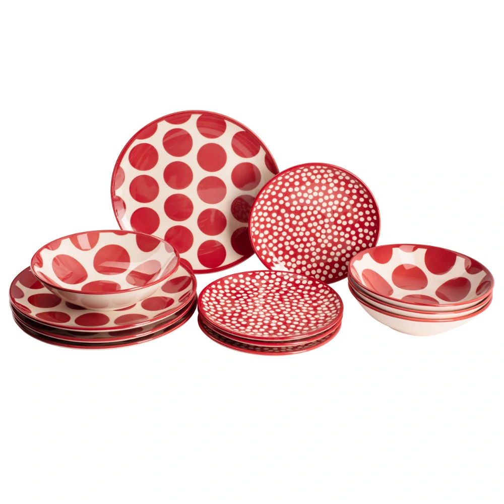 Benetton Home, Set 12Pcs Tableware (4Xdinner Plate 27cm 4xdeep Plate 21cm 4x Dessert Plate 19cm) Stoneware Red Dots, BE-2063